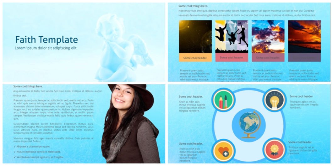 Faith PowerPoint template is wonderful for Religion and Spiritual presentations. This PPT template features nice blue background theme, which symbolizes sky, harmony, faithfulness, infinity. These are just perfect expressions for Faith presentation.