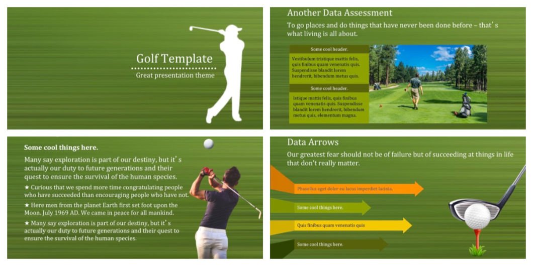 It is pretty standard that golf is played on a large open course, that is why background picture has a green, grass field background color. Present your concept across viewers with this amazing golf PowerPoint template.