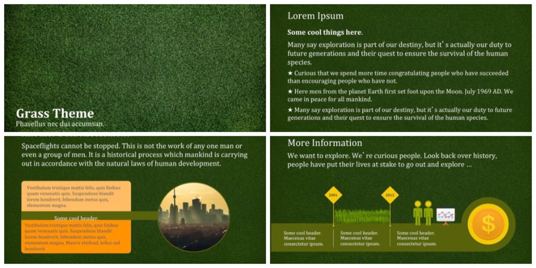 A nice choice for nature presentations to represent topics related to our environmental problems or for ecology presentation. As this PPT presentation features green grass theme, it is excellent for any subject related to growth and nature.