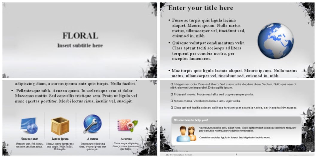Another free and very creative PowerPoint template. Use this grunge floral template when you want your presentation to look extra special. The main color accent of this PPT template is grey.