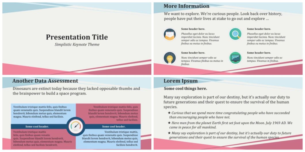 This theme for PowerPoint has a stylish and clean layout, with blue and pink as main color tones. Runs great for any topic as it features fresh and simple style, which will present any thought or idea in clear and understandable manner.