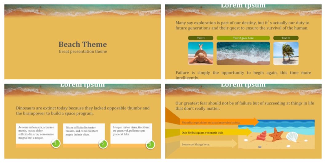 It is wonderful summer beach Powerpoint template, which is ideal for vacation or holiday presentations. It includes many types of slides and will enable you to develop a professional presentation instantly. You can change the texts, replace the background, and go with your pictures and icons.