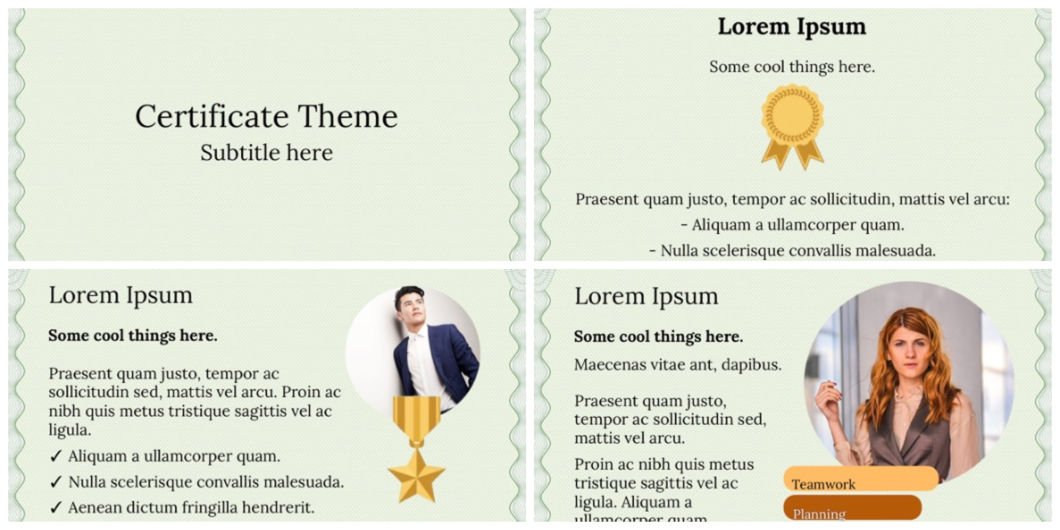 Size of this template is 842px x 595px. It uses light background color with nice borders to make it more special, and any black text will look sharp and clean. Download it free and build awesome certificate and award presentations in PowerPoint.