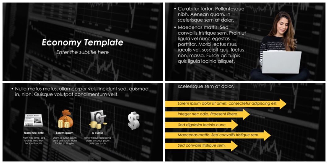 Economy PowerPoint template is a nice template for investing opportunities presentations. The dark background with investment theme makes this design the right choice if you are looking for money layouts or global economy theme. This free PowerPoint theme will allow you to make a successful presentation quickly.