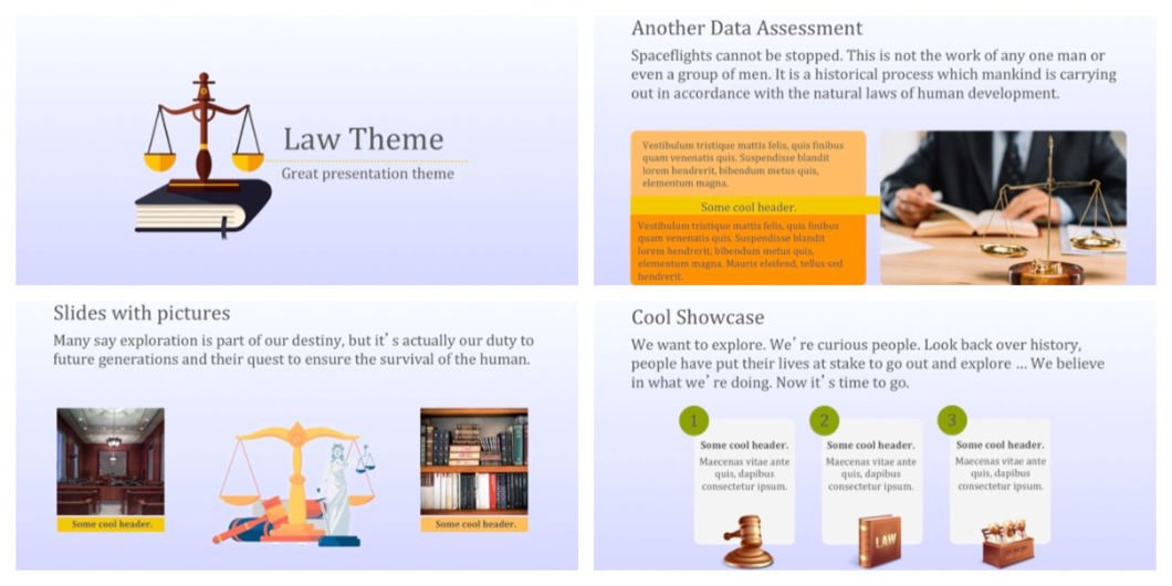 The modern design of this template can be used for demonstrations about legislative instrument of a higher agency like court or trial. You can change the texts, replace the background, and go with your images and icons.