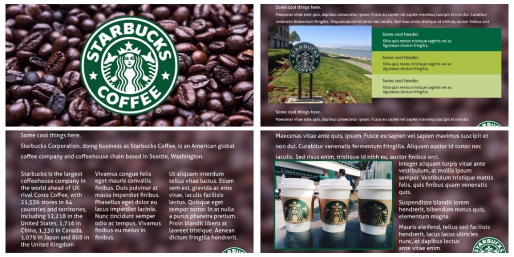 We recommend this Starbucks slides template for coffee demonstrations. It uses same green color accent as in Starbucks, as it is the main color in their logo.