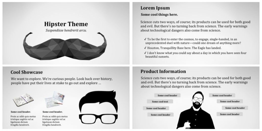 Hipster PowerPoint template is excellent for stylish and cool presentations. Suitable for professional or creative talks, simply readjust it to your brand easily by replacing the content with yours.