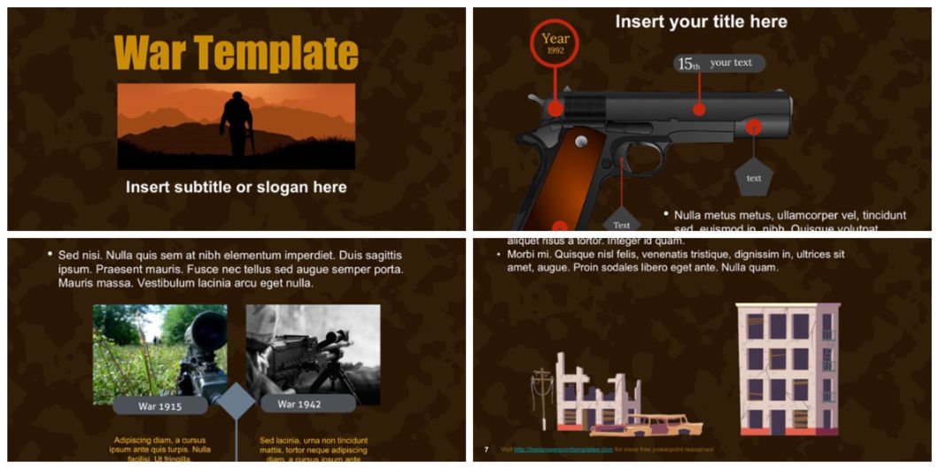 This War PowerPoint template is good for presentations on War and Guns. Background features a dark brown military camouflage texture.