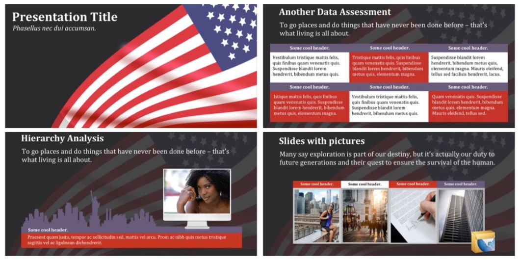 A unique color palette is used for this theme – color basis is taken from an American flag. Clean and stylish, this PPT theme will help you make a professional PowerPoint presentation with no effort and in no time.