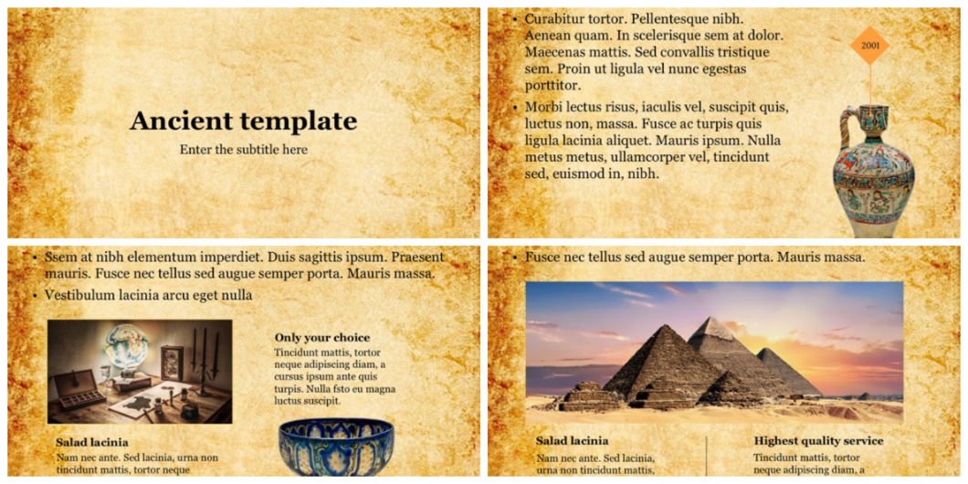 You can download this ancient PPT template and use it absolutely free as PowerPoint presentations of history or antique, etc. Ancient Greece, Rome or Egypt is a perfect topic for this old theme too.