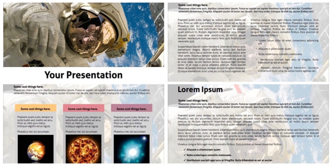 Another impressive Astronaut Powerpoint Template, which is great for Space PowerPoint theme. This PowerPoint is intended to be used in astronomy PPT presentations or a topic about human spaceflight program. Just adjust this theme to make your presentation more attractive.