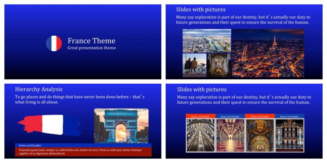 France PowerPoint template is contemporary PowerPoint layout that will allow you to create a top notch presentation easily. It is well-developed and has a clear design.