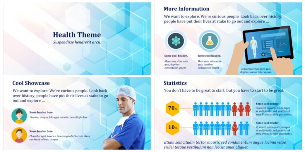 Here is a PowerPoint template for medical or healthcare professionals. It is fresh and modern layout on a light blue background. You can use this PPT theme for presentations related to medicine, health or disease, or medical diagnoses.
