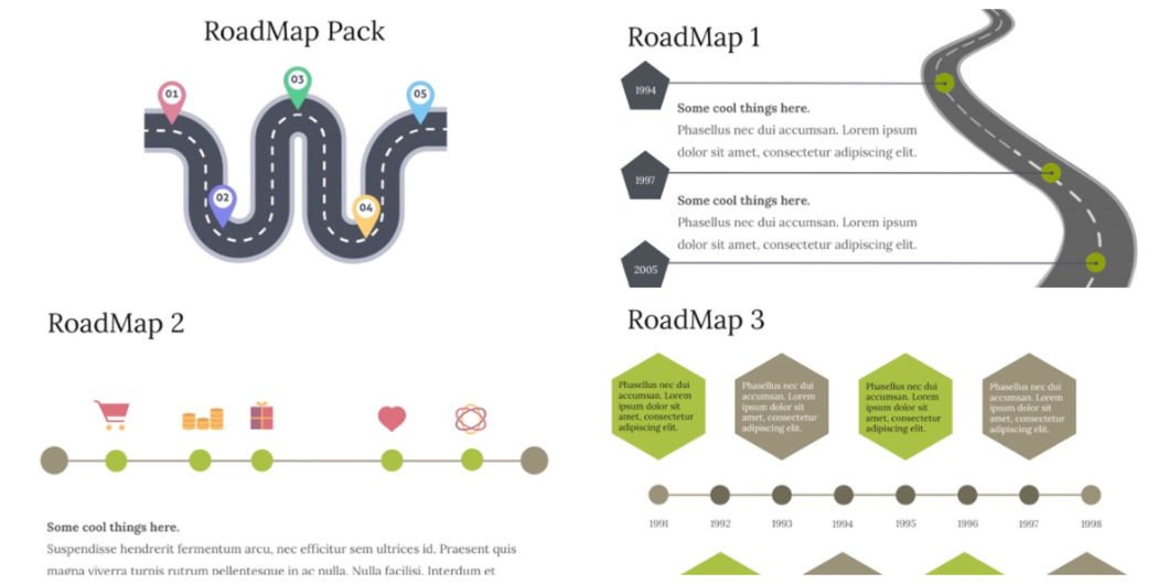 These are great roadmap slides, which are useful when you want to simplify your idea and clarify your project. Easily modify and customise them as they are vector shapes inside the PowerPoint.