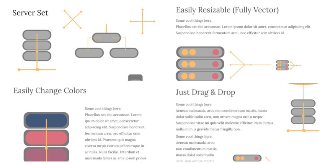 Another excellent PowerPoint file holding simple Server set items. All those patterns and elements inside this free server template are vector based, which means you can edit and modify color, size, move separate shapes and components apart and so on. If you need to showcase Network or Computer systems, this file is a way to go!
